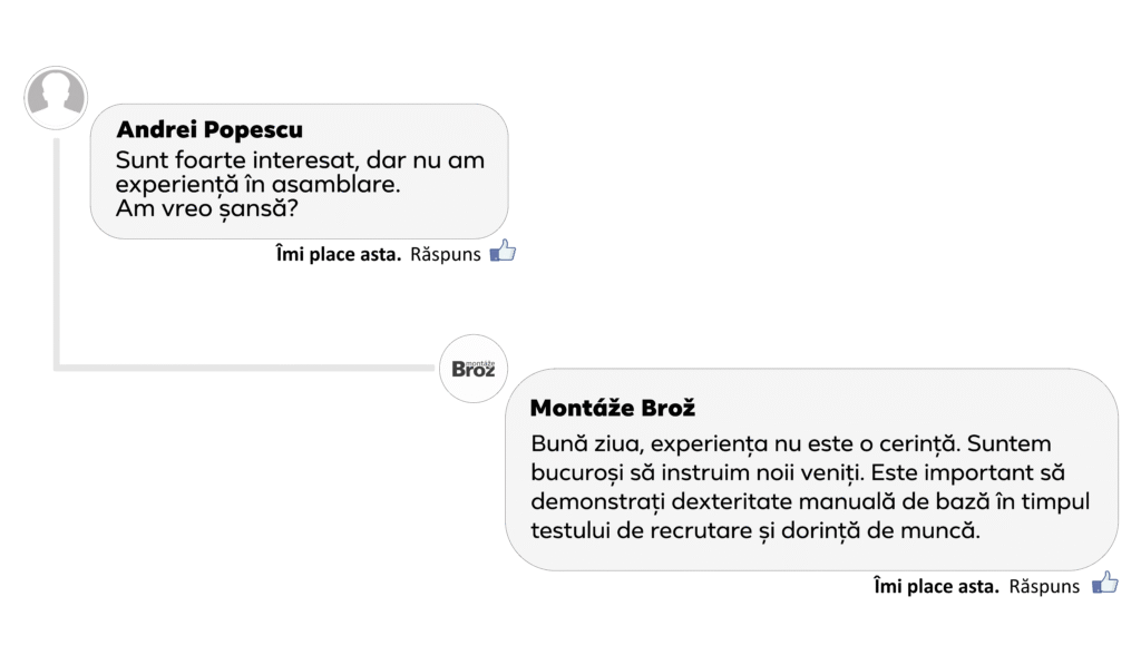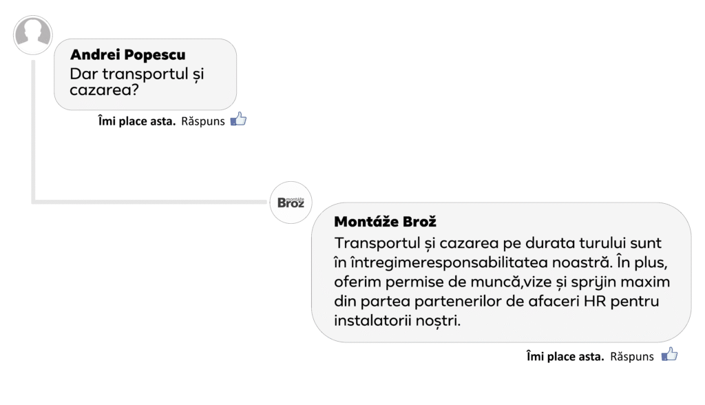 Montáže Brož este o companie care, în prezent, asigură locuri de muncă pentru peste 800 de angajați permanenți. Chiar dacă facem deja parte din categoria companiilor mari, punem accent pe confortul fiecărui angajat și ne interesează feedbackul acestora. Conducerea companiei sprijină întâlnirile între echipele de lucru și în afara activităților profesionale. Organizăm în mod regulat teambuildinguri, workshopuri educaționale și cursuri de instruire. În cadrul activităților de sponsorizare susținem tinerii piloți talentați din lumea motorsportului și nu ne este străină nici responsabilitatea socială sub forma activităților caritabile. Sloganul nostru, care răsună în toată compania, indiferent de continent, este: „Suntem Brožáci!”